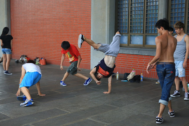 Тут же это происходит прямо у дверей мемориального комплекса. Местные подростки-школьники, тусуюсь группами по 5-7 человек, включает магнитофоны с бравой музыкой прям на ступеньках комплекса, выделывая свои акробатические пассажи. Девушки, стоящие отдельными групками, также под "свою" техно-попсу занимаются оттачиванием движений, постоянно косясь в отражения стекол комплекса.